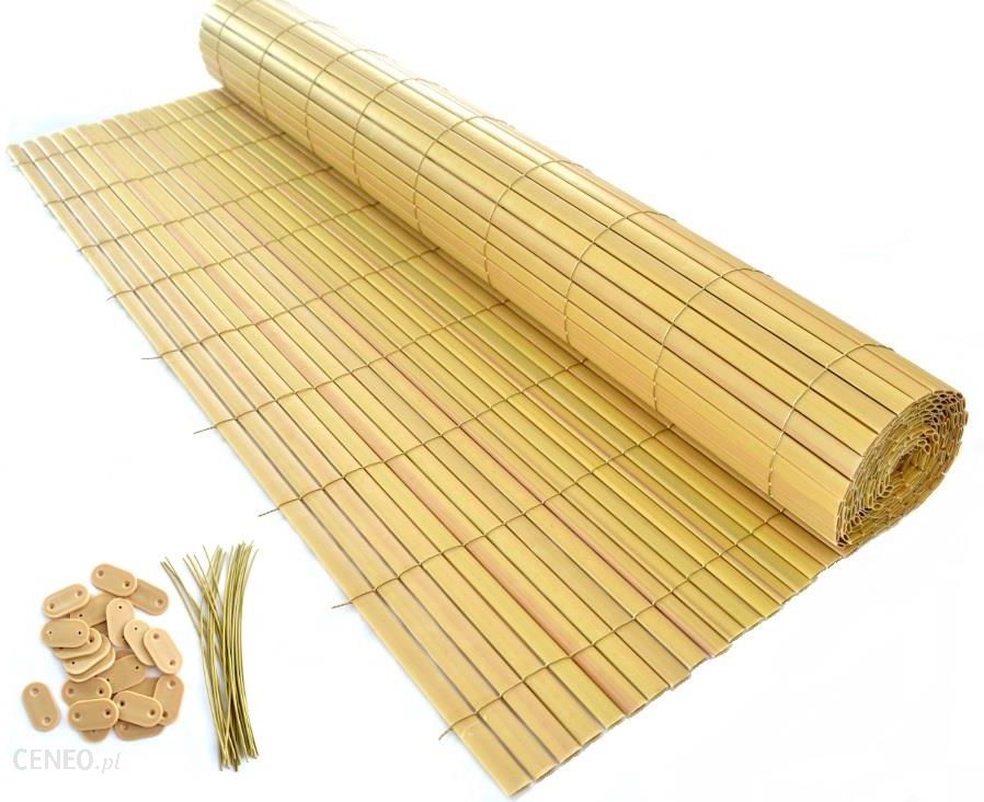 DWUSTRONNA MATA OSŁONOWA Z PCV 1,5×3 m KOLOR : bambus + GRATIS ZESTAW MONTAŻOWY Maty z tworzywa sztucznego charakteryzuje wysoka odporność na warunki atmosferyczne. Sprawdzą się świetnie na balkonach, tarasach i ogrodzeniach. W porównaniu z matami z surowców naturalnych wyglądają „idealnie” , wszystkie listewki są identyczne, gęsto ułożone. W naszej ofercie znajdą Państwo maty z listewek PCV w kolorach : ZIELEŃ, BRĄZ, BAMBUS i ANTRACYT Dostępne rozmiary: 0,8 x 3m, 0,9 x 3m, 1 x 3m, 1 x 5m, 1,2 x 3m, 1,5 x 3m , 1,8 x 3m , 2 x 3m. Zdjęcia na naszych aukcjach są zrobione przez nas, naszym produktom. W ofercie posiadamy również maty z surowców naturalnych : wikliny, trzciny i bambusa. Charakterystyka: Listewki 13 mm x 4 mm (elipsy) , grubość tworzywa 0,4 mm Wiązane co 10 cm, gęstość 1,35 kg/m2 Do każdej maty dodajemy gratis zestawy klipsów montażowych w ilościach odpowiednich do wysokości maty: 80-100 cm – 22 klipsy 120 – 150 cm – 33 klipsy 180 – 200 cm – 44 klipsy